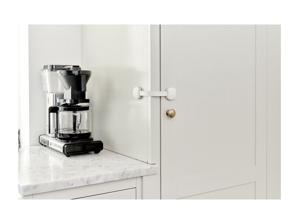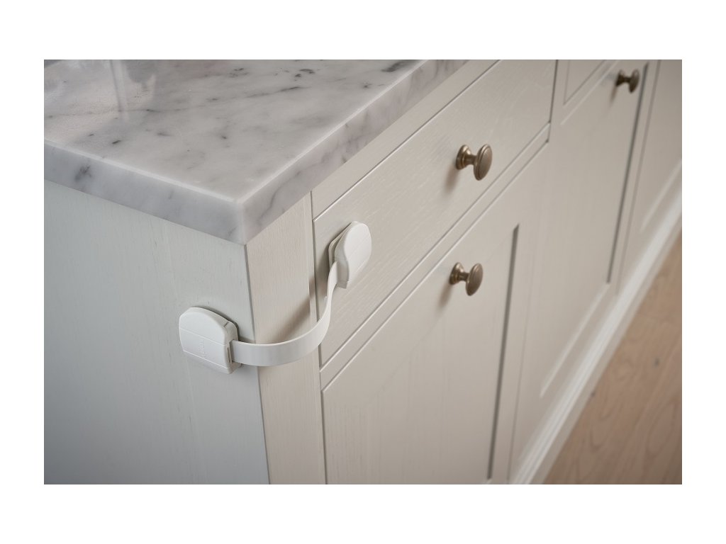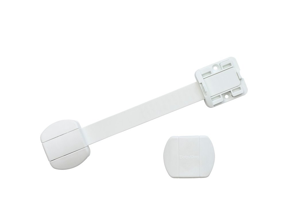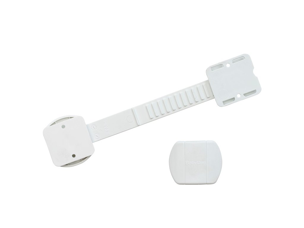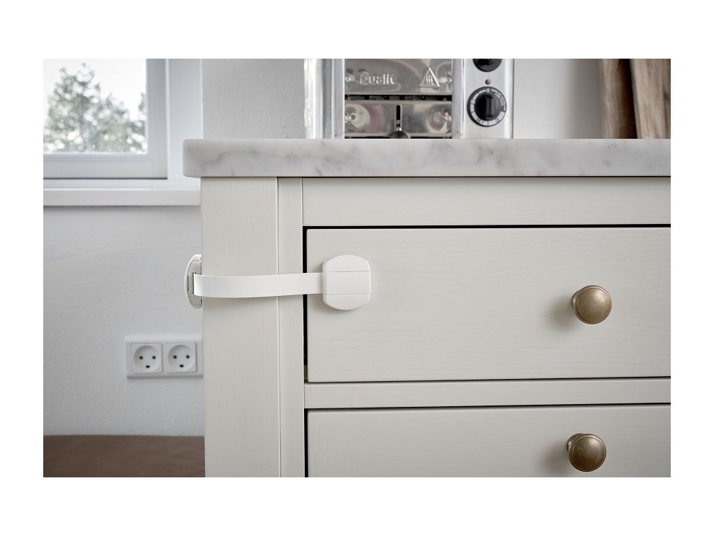 Univerzális zár. Biztosíthatja vele, többek között, szekrényajtók, fiókok, hűtők, fagyasztók és szárítók ajtaját. Próbálja úgy elhelyezni, hogy a gyermek ne érhesse el. Kioldása az egymással szemben elhelyezett kioldógombok egyszerre történő megnyomásával lehetséges. Hossza több fokozatba állítható. Egyenes felületekre ragasztócsíkkal (öntapadó), egyenetlen felületekre csavarokkal rögzíthető.