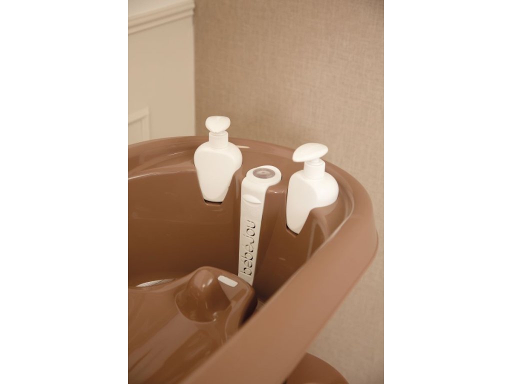 Egyetlen pillantással leolvashatja a pontos vízhőmérsékletet és fokról-fokra folyamatosan figyelheti a víz hőmérsékletének változását. A termo babakád beépített szappan- és sampon adagolóval rendelkezik. Így minden a keze ügyében lesz, fürdetés közben nem kell keresgélnie a szükséges dolgokat. Ezáltal soha nem fog megtörténni, hogy gyermekét felügyelet nélkül a kádban kéne hagynia, ami a sérülések gyakori oka. A termo babakád 2 kattintással könnyen és biztonságosan felhelyezhető a kompatibilis állványra. A beépített vízelvezető rendszer segítségével könnyen kiürítheti. Hollandiában gyártották.