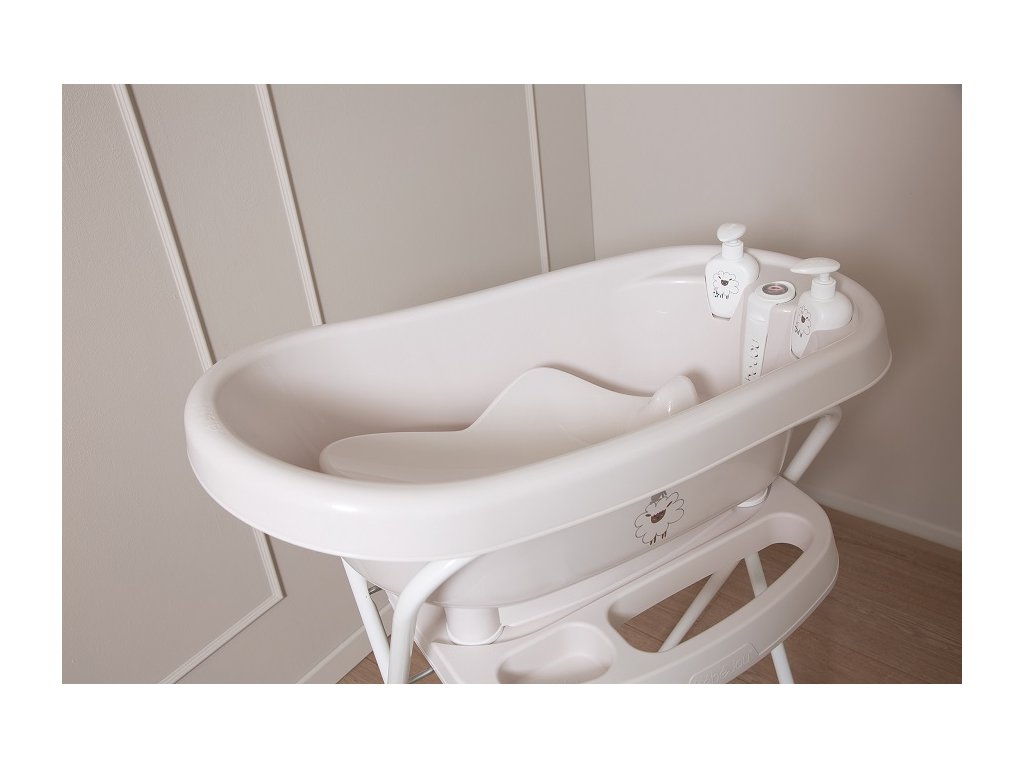 Egyetlen pillantással leolvashatja a pontos vízhőmérsékletet és fokról-fokra folyamatosan figyelheti a víz hőmérsékletének változását. A termo babakád beépített szappan- és sampon adagolóval rendelkezik. Így minden a keze ügyében lesz, fürdetés közben nem kell keresgélnie a szükséges dolgokat. Ezáltal soha nem fog megtörténni, hogy gyermekét felügyelet nélkül a kádban kéne hagynia, ami a sérülések gyakori oka. A termo babakád 2 kattintással könnyen és biztonságosan felhelyezhető a kompatibilis állványra. A beépített vízelvezető rendszer segítségével könnyen kiürítheti. Hollandiában gyártották.
