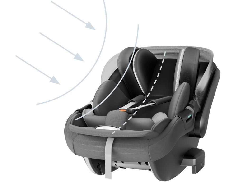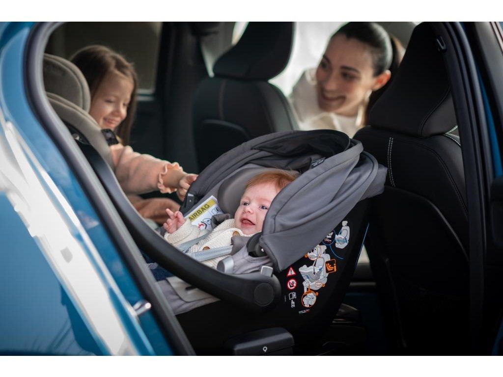 - A járműben menetiránynak háttal van rögzítve, ideálisan a hátsó üléseken. Az anyósülésre csak akkor szabad rögzíteni, ha ki van kapcsolva a légzsák.