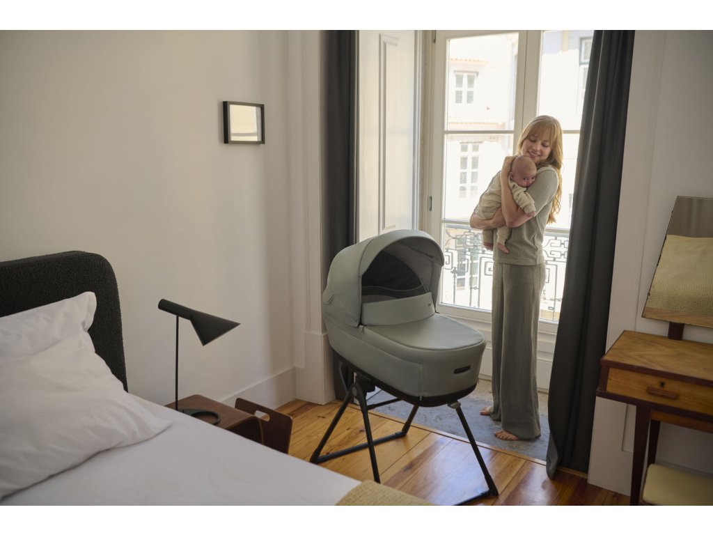 Stand UpTM állvány. A sétáról visszatérve tökéletes segítség lehet a praktikus és higiénikus Stand Up állvány, mivel nagyon könnyedén áthelyezhető rá a lakásban a mózeskosár vagy az autósülés. A baba zavartalanul aludhat tovább a jól ismert környezetben és a mózeskosárból egyszeriben kiságy lesz. Egy rövid szundítás idejére a autósülés (babahordozó) is feltehető a Stand Up állványra.