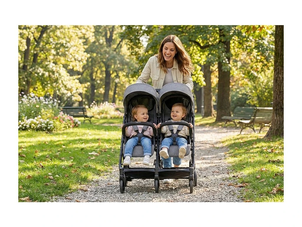 Könnyű és kompakt babakocsi ikrek számára. Alkalmas születéstől történő használatra ikrek számára, valamint kis korkülönbséggel született testvérek számára egyaránt.