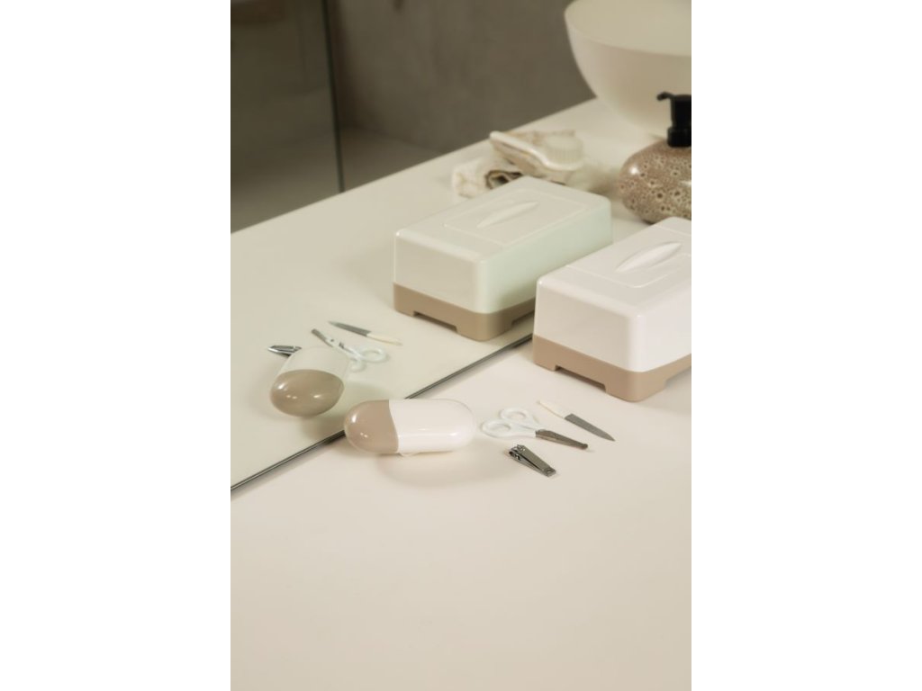• A dobozban fém lekerekített olló, csipesz és reszelő található