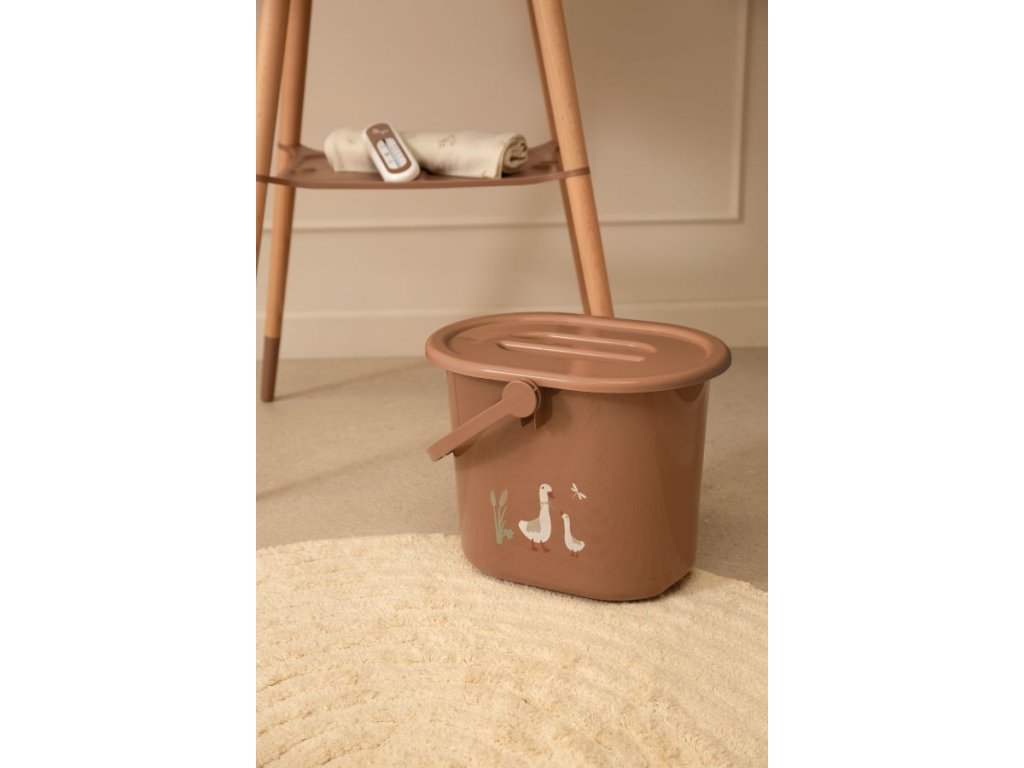 A Bebe-jou pelenkatartó vödör fedéllel, barna színben libás mintával, egy sokoldalúan kihasználható és praktikus eszköz.